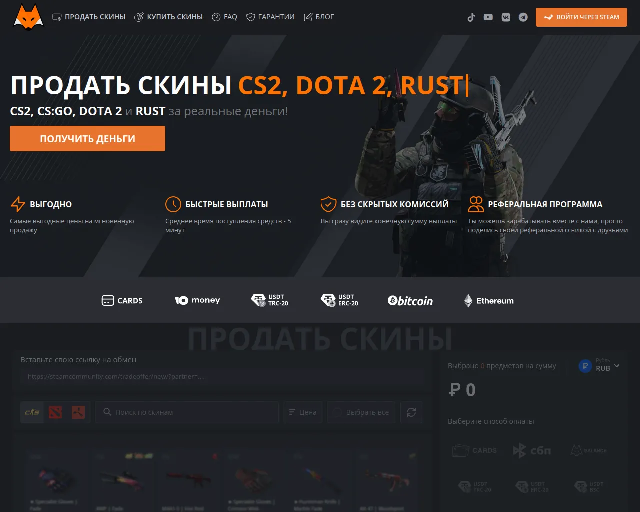 Продать скины КС2, КС ГО и Дота 2 за реальные деньги на LIS-SKINS