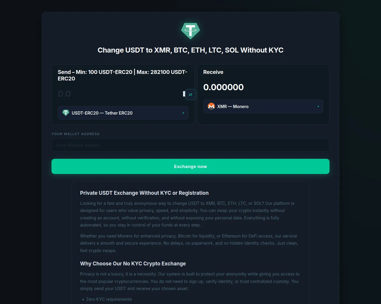 Change USDT to XMR BTC ETH LTC SOL No KYC Fast Swap