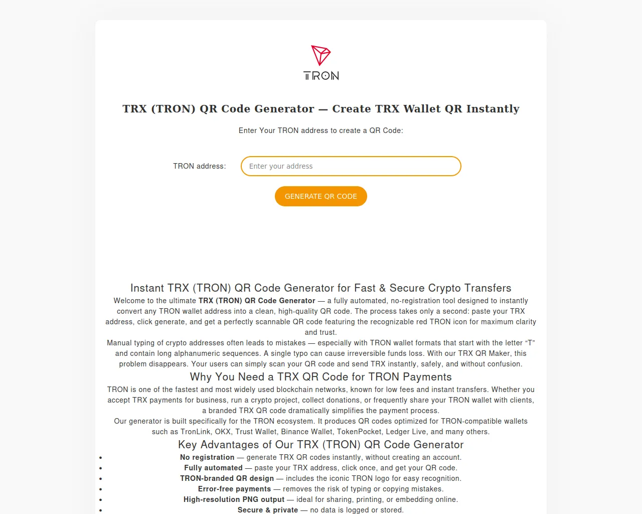 TRX (TRON) QR Code Generator — Instant TRX Wallet QR Maker