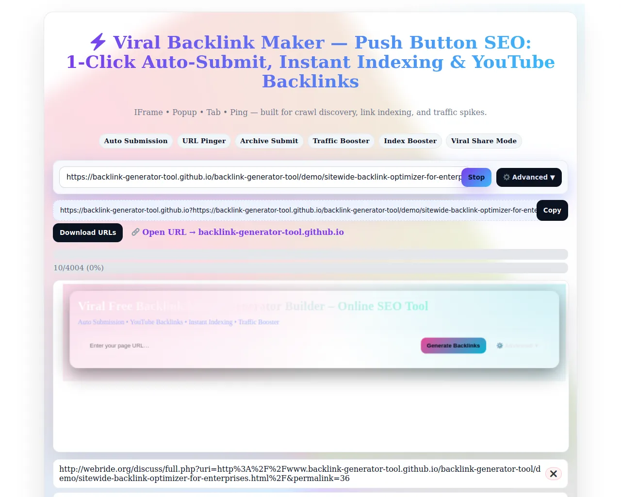 🚀 Viral Backlink Maker — AI SEO Booster for 1-Click Auto Submission, Instant Indexing & YouTube Backlinks (Popup/Tab/IFrame/Ping)