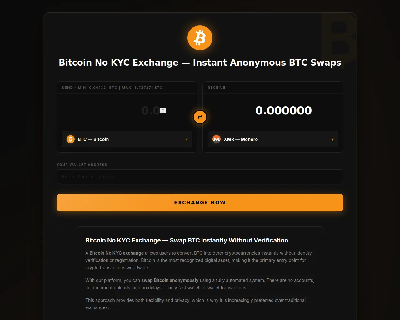 Bitcoin No KYC Exchange — Instant BTC Swap to XMR, USDT, ETH