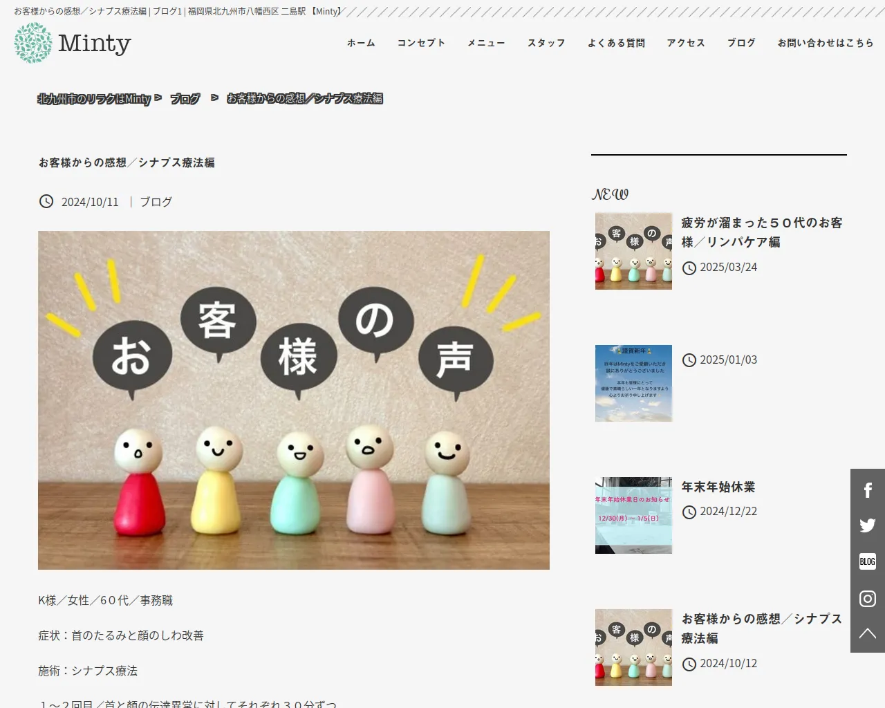 お客様からの感想/シナプス療法編 | ブログ1 | 北九州市でリンパケアをお探しなら【Minty】