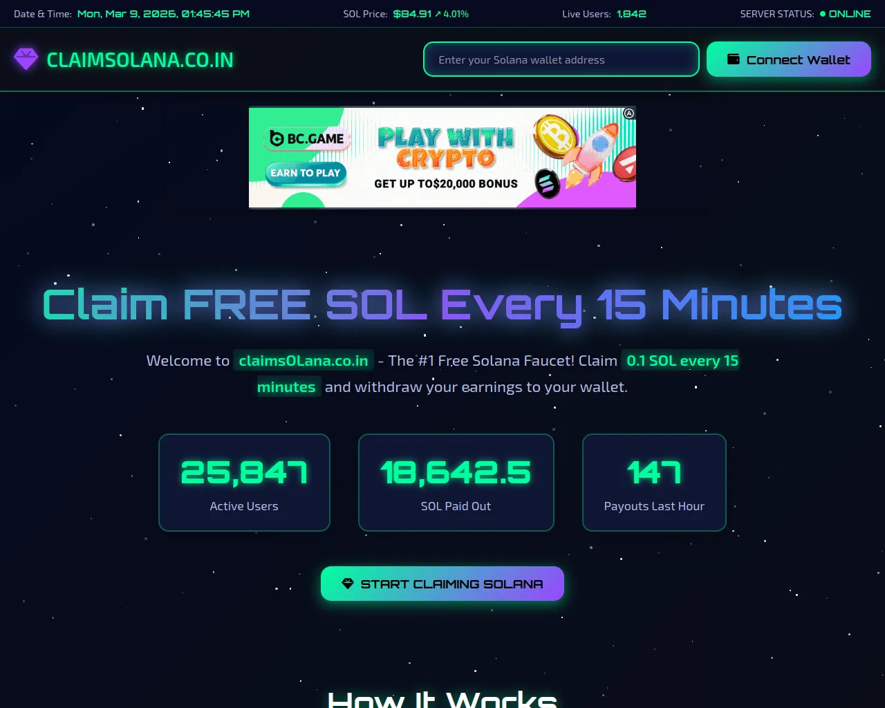 Claim Free Solana | Get 0.1 SOL Every 15 Minutes | claimsolana.co.in