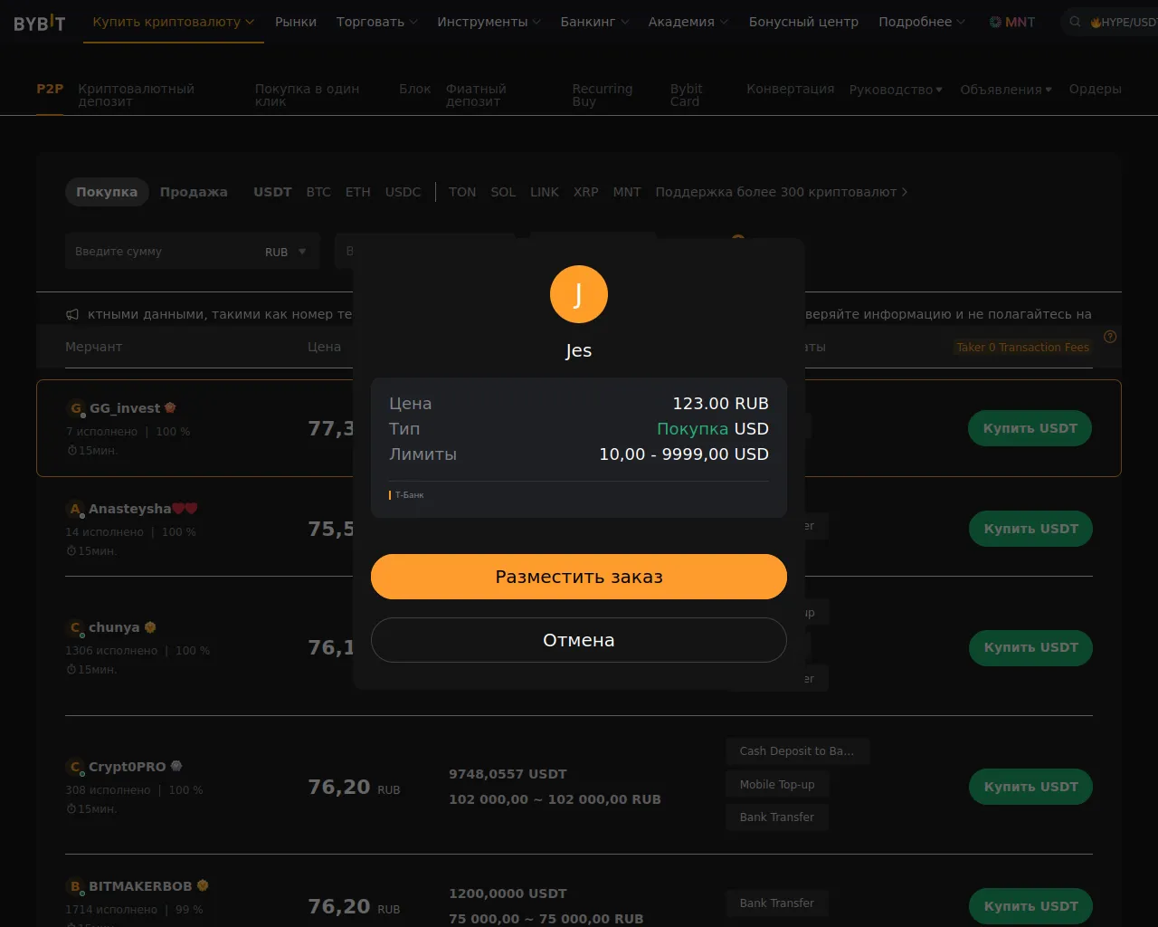 Покупка USDT за RUB через криптотрейдинг на Bybit P2P