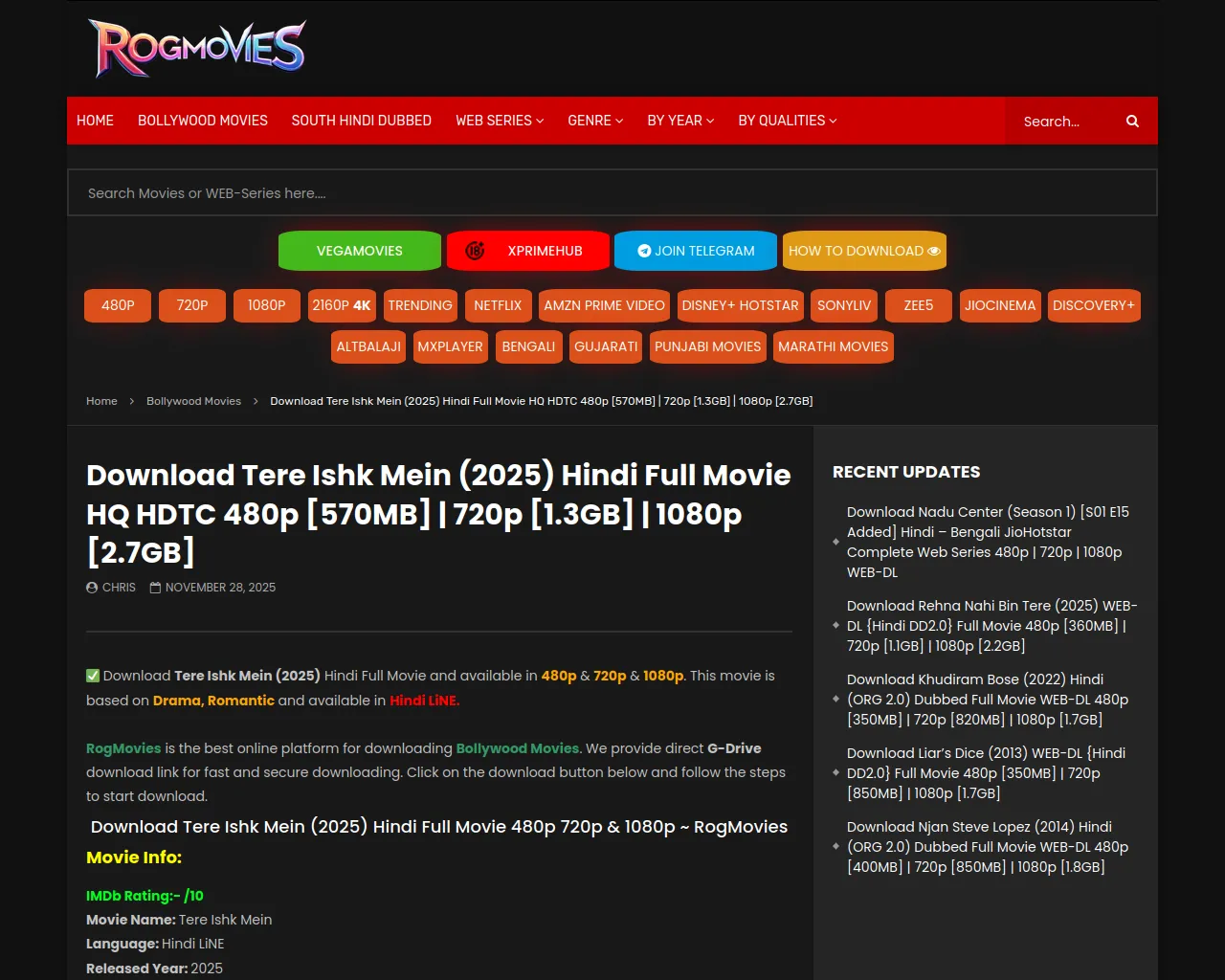 Download Tere Ishk Mein (2025) Hindi Full Movie HQ HDTC 480p [570MB] | 720p [1.3GB] | 1080p [2.7GB] | Rogmovies | RogMovies 2025, Vegamovies Official, Rogmovies.in