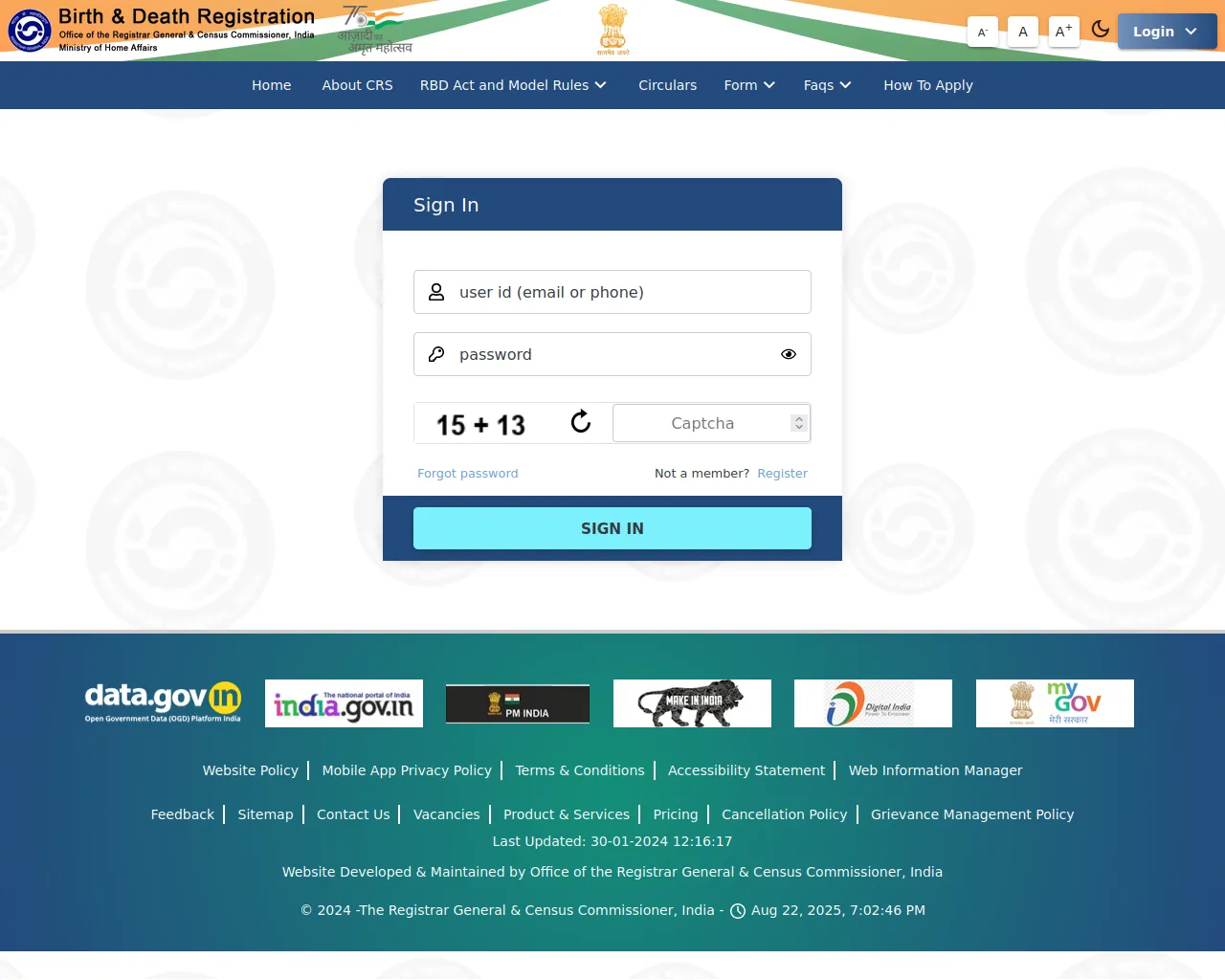 Login | Civil Registration System | Government of India