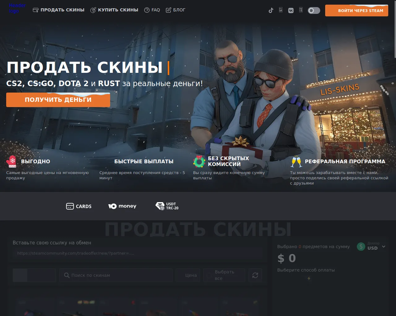 Продать скины КС2, КС ГО и Дота 2 за реальные деньги на LIS-SKINS