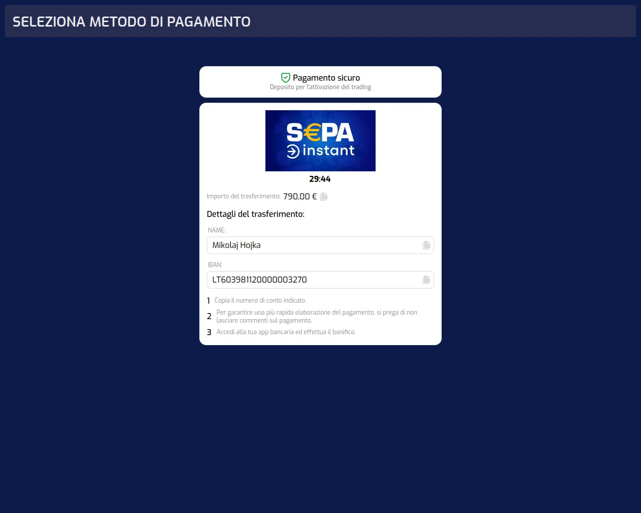 Deposito per l'attivazione del trading