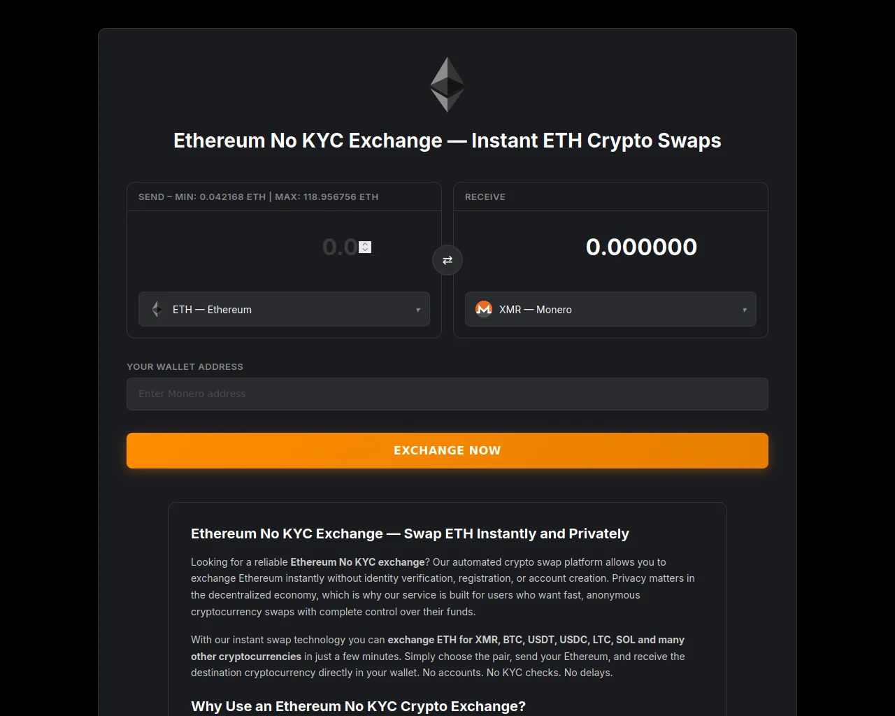 Ethereum No KYC Exchange — Swap ETH to XMR, BTC, USDT Instantly