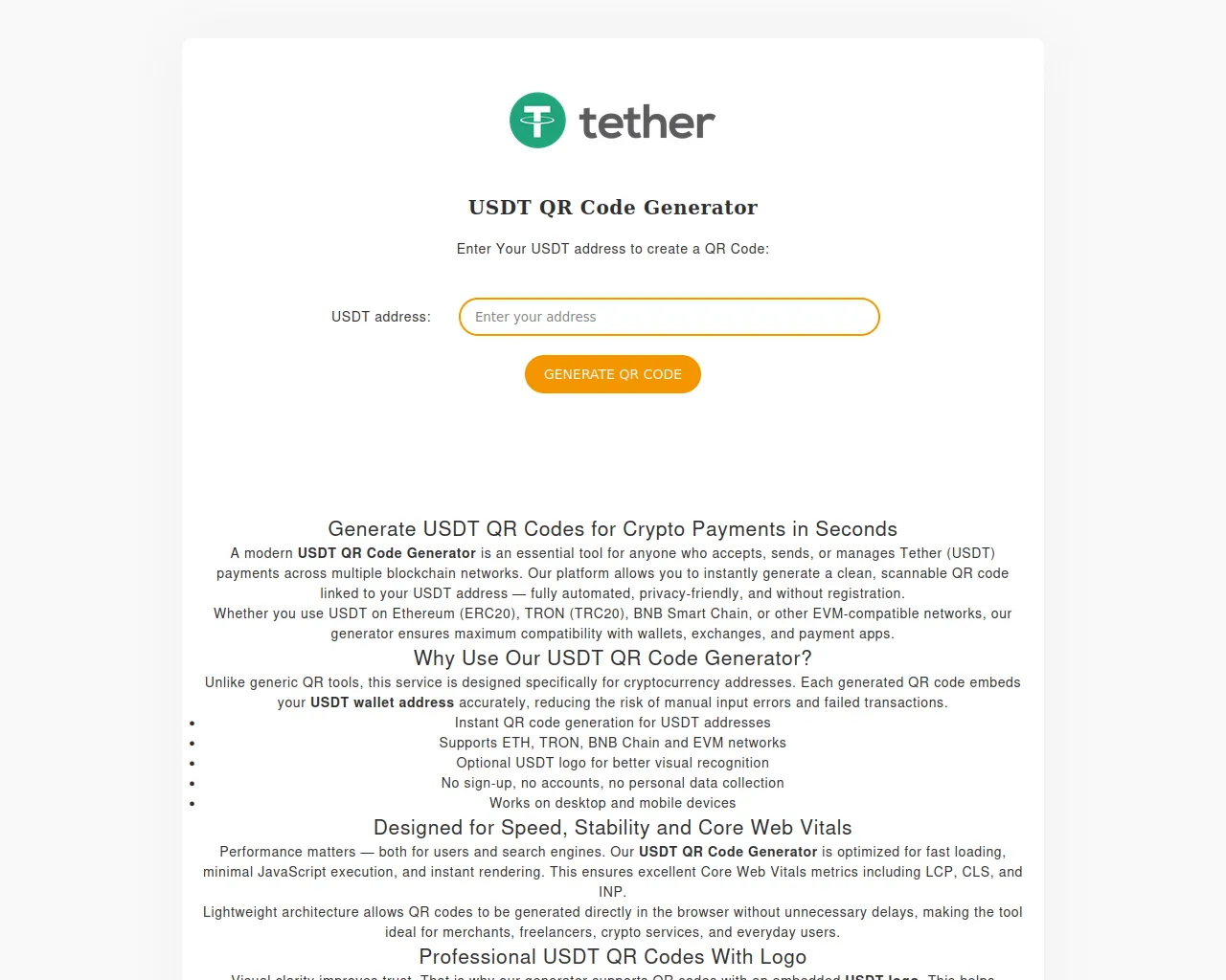 USDT QR Code Generator — Create Tether Address QR Instantly