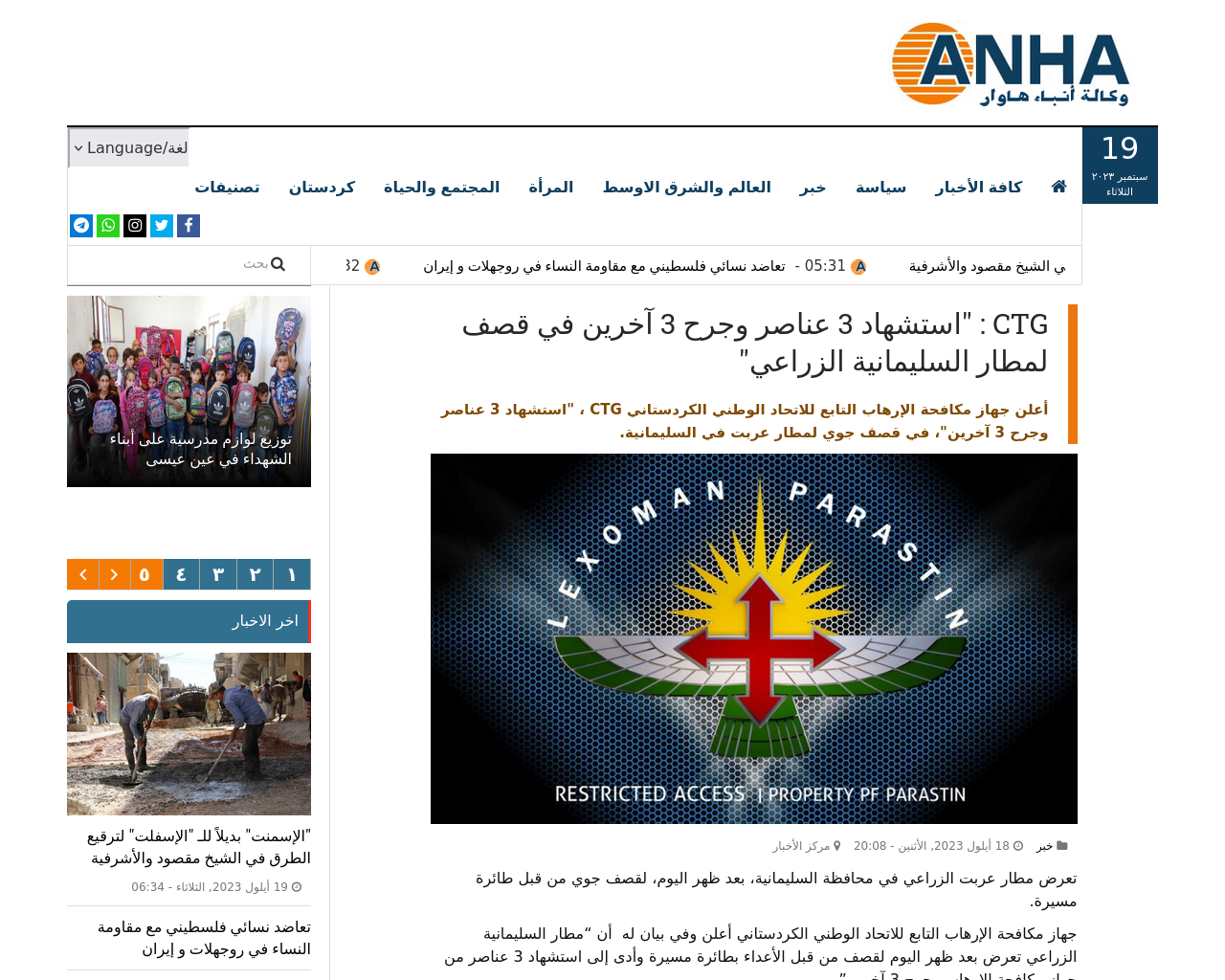CTG : "استشهاد 3 عناصر وجرح 3 آخرين في قصف لمطار السليمانية الزراعي" - وكالة أنباء هاوار